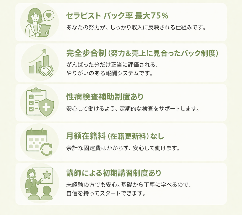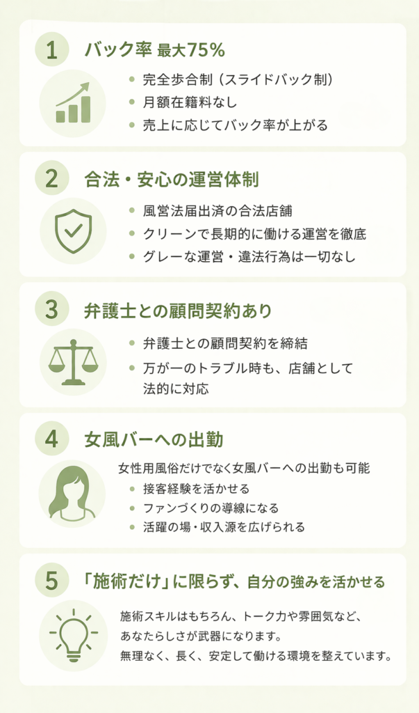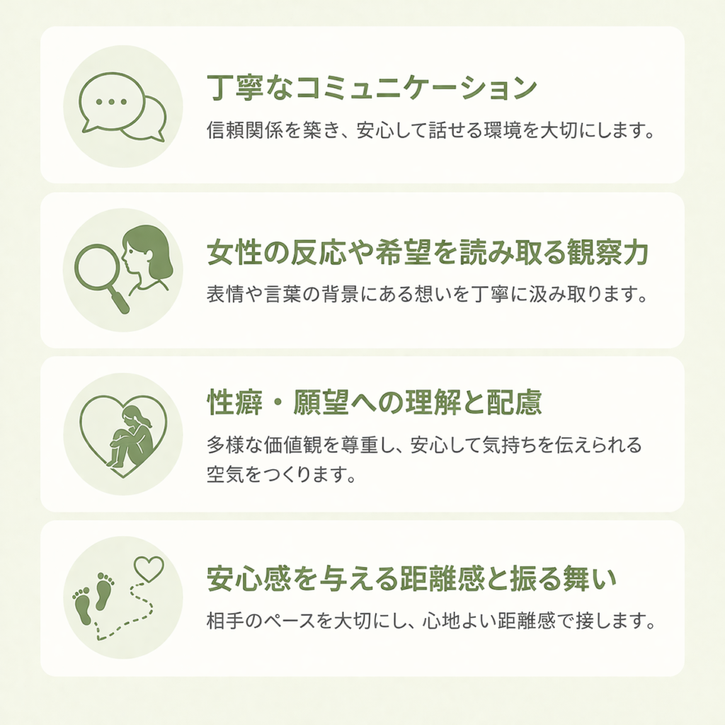 幅広い性癖・願望に寄り添い、女性一人ひとりの「誰にも言えない気持ち」「心の不安」「満たされたい欲求」を大切にしています。